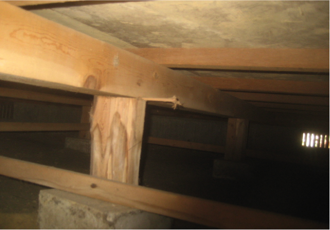 - 16)玄関框(かまち)の被害 / 床下からの蟻道は見られず恐らく玄関土間側かブロック基礎から被害が上がっているものと思われます。
